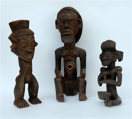 Arte africana, lotto di tre sculture in legno raffiguranti figure femminili, di cui due assise (h max cm 61) (difetti)