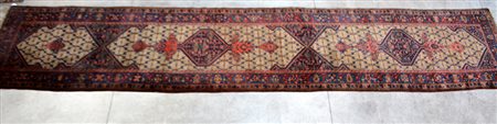 Decoro con due importanti medaglioni lanceolati nei toni del rosso, blu e verde su campo in lana cammello decorato in tinta naturale (cm 579x118) (lievi difetti)