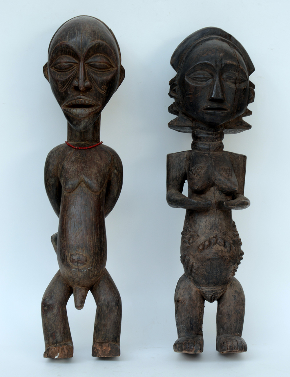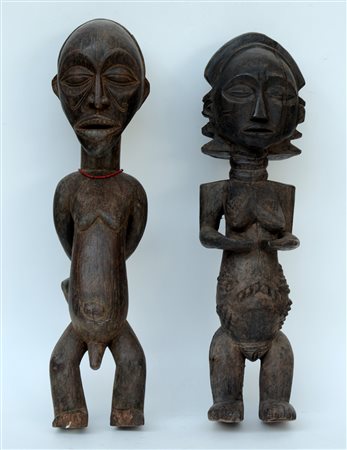 Arte africana, lotto di due sculture in legno intagliato raffiguranti un personaggio maschile con collana e uno femminile (h max cm 72) (difetti)