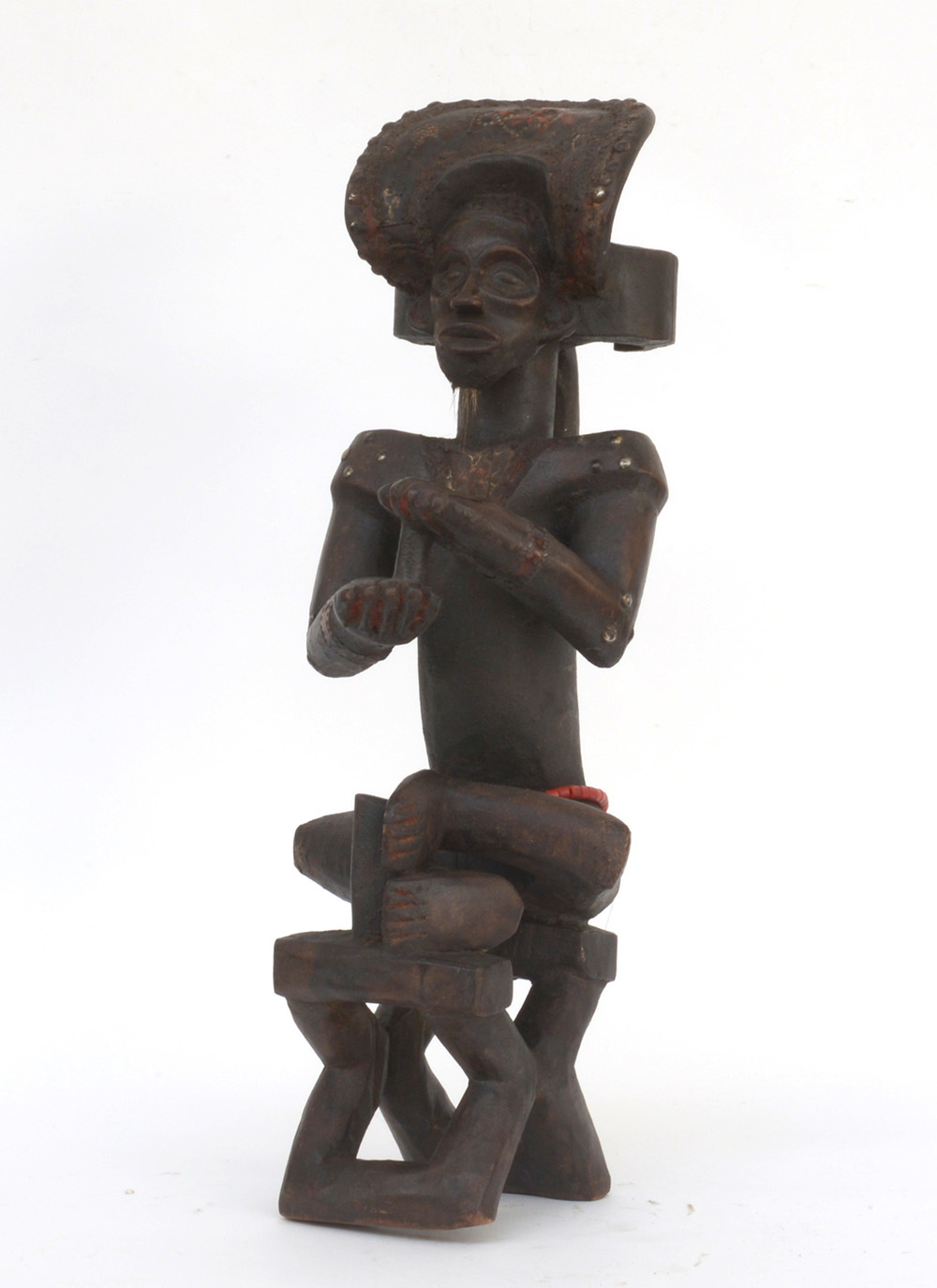 Arte africana, scultura in legno e applicazioni in metallo con raffigurazione maschile assisa (h cm 68) (difetti)