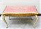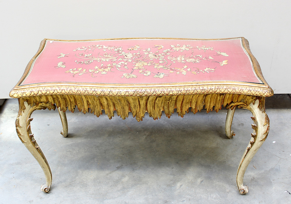 Tavolino in legno laccato e dorato intagliato nelle fasce a motivi concatenati (cm 94x57x50) (difetti)