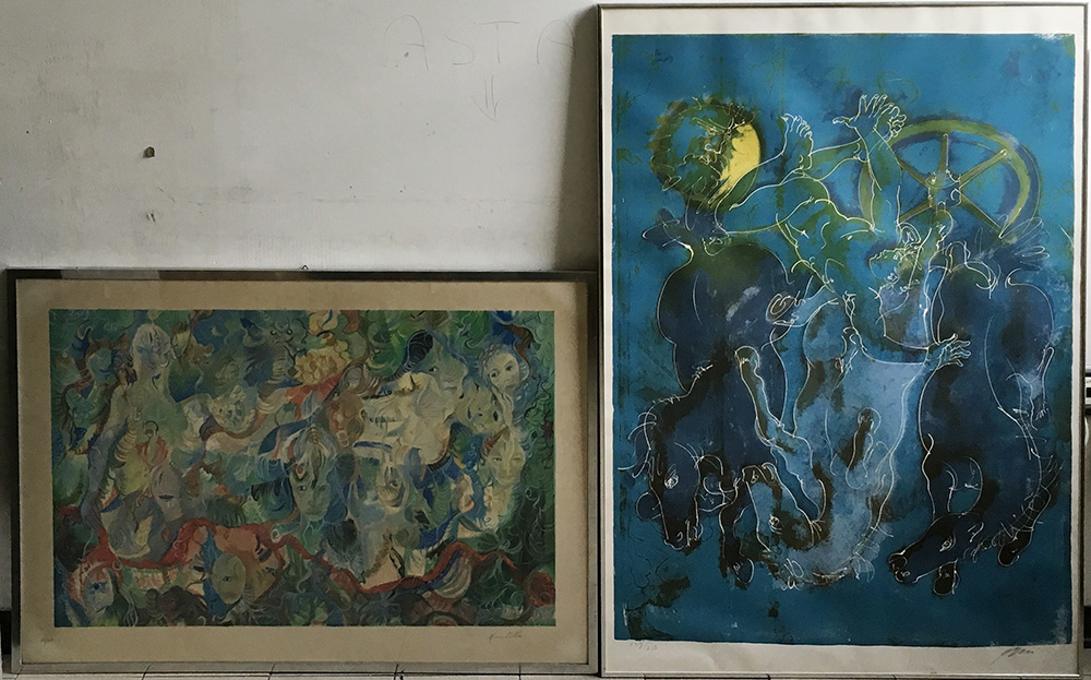 Lotto di due litografie moderne: una di Hans Erni e l'altra indecifrata, soggetti e misure diverse, in cornici (difetti)