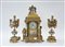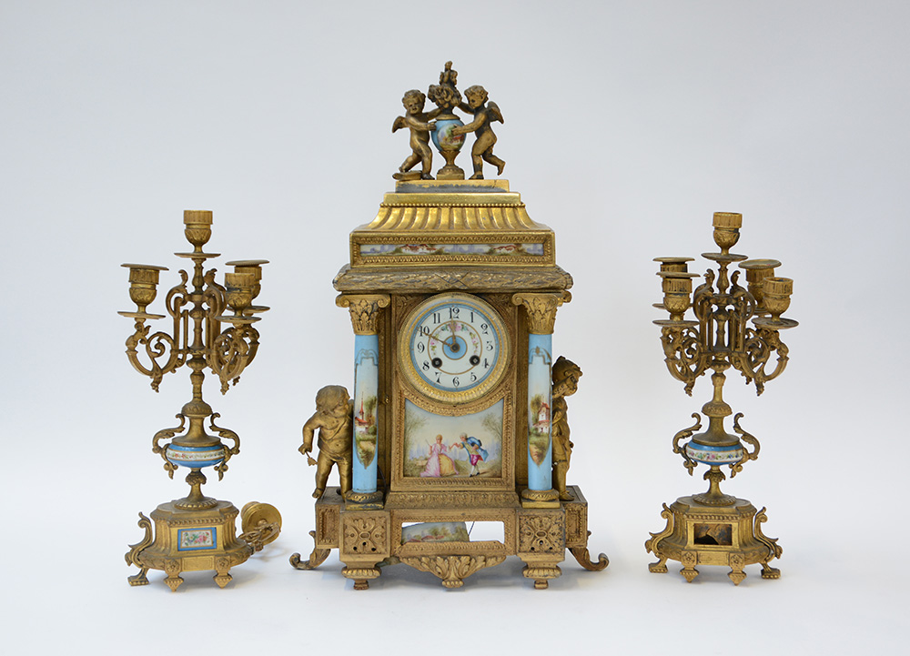 Trittico da camino in metallo dorato decorato con placche in porcellana policroma composto da pendola e due candelieri a cinque fiamme (difetti e mancanze)