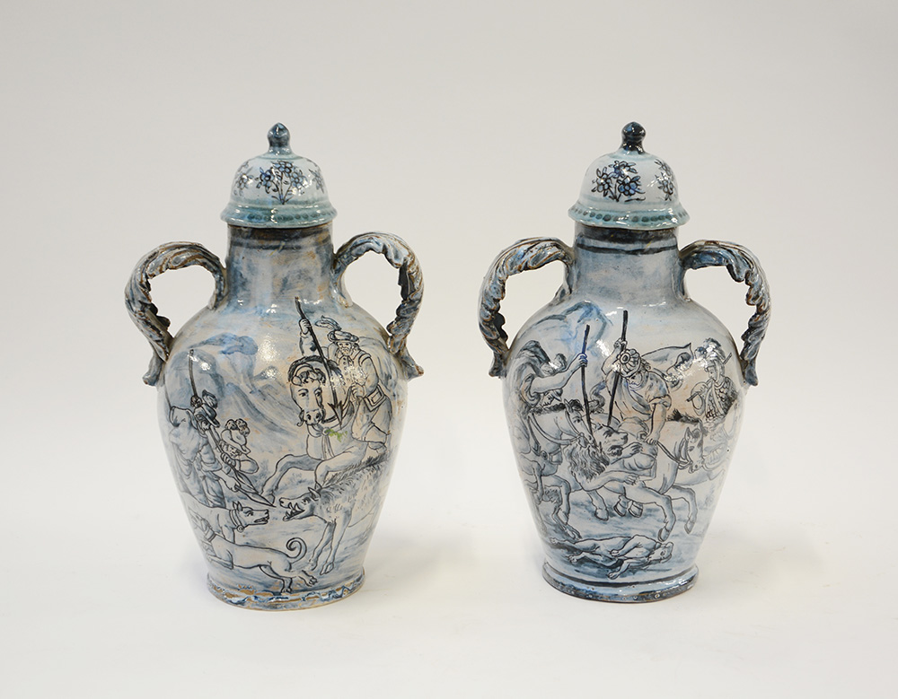 Coppia di vasi biansati con coperchio, in maiolica decorata in monocromia con scene di caccia a cavallo (h cm 40) (difetti)