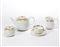 Tea set composed by a teapot, sugar bowl, milk jug, six cups and six saucers. Manufacture of Richard Ginori, Shower, 1935ca. White underglaze porcelain with concentric gold ring motifs. Marked "Richard-Ginori 32 = 9 K" and with the scroll of the Pittoria of Doccia under some samples. (different sizes)