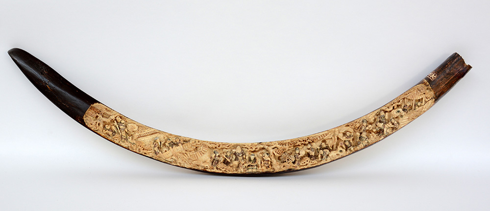 Zanna in avorio fossile scolpito con figure (h. 109 cm.)(difetti)