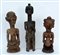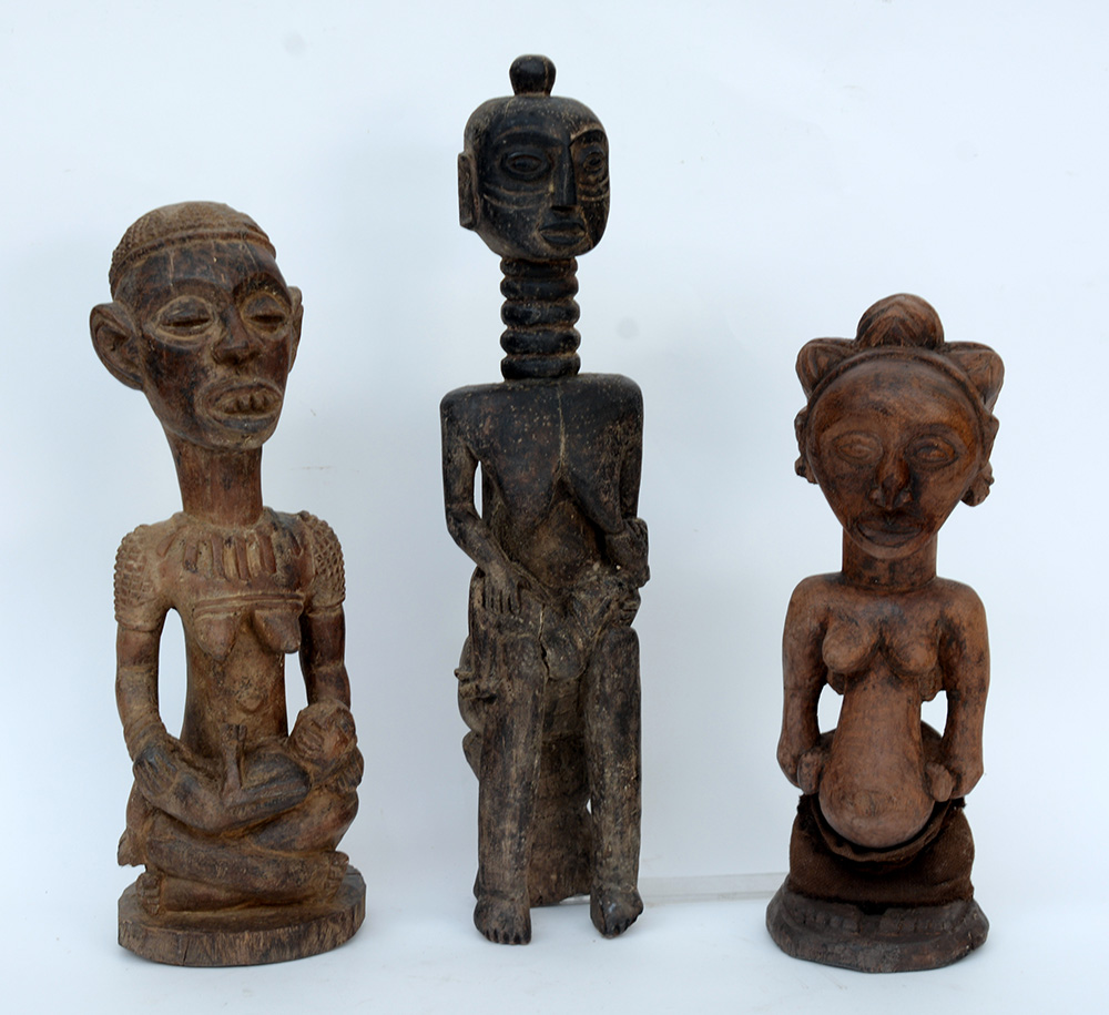 Arte africana, lotto di tre sculture in legno con figure di maternità, una con inserto in tessuto (h max cm 48) (difetti)