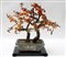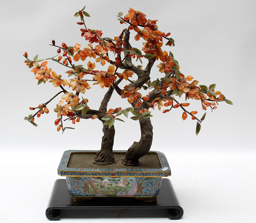 Portafiori cloisonnet a fondo turchese contenente una pianta simulante un bonsai con foglie e fiori in pietra dura (h cm 51 ca) con base in legno (difetti)
