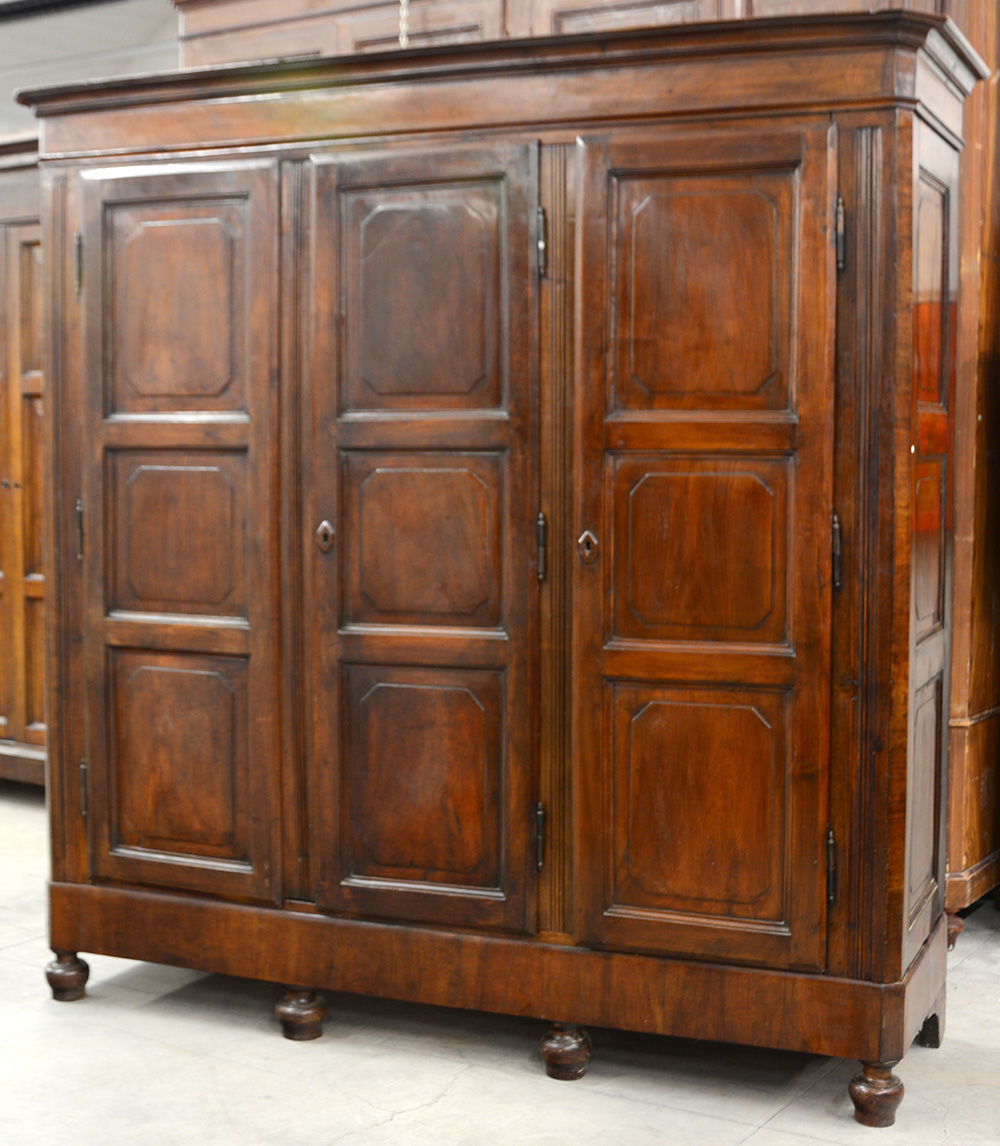 Armadio-guardaroba in noce a tre ante riquadrate con piedi torniti. Secolo...