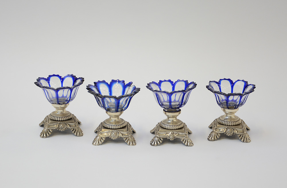 Gruppo di quattro saliere in argento con coppe in cristallo, punzoni di Milano, secolo XIX