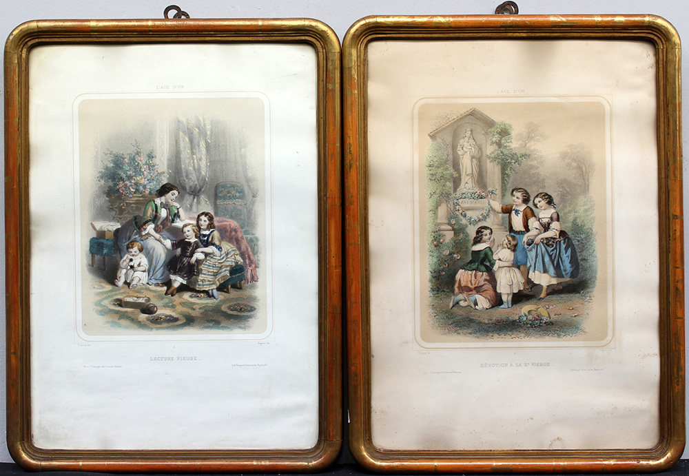 Gruppo di quattro litografie a colori raffiguranti fanciulli, Francia secolo XIX (cm 52x36) in cornici (difetti)