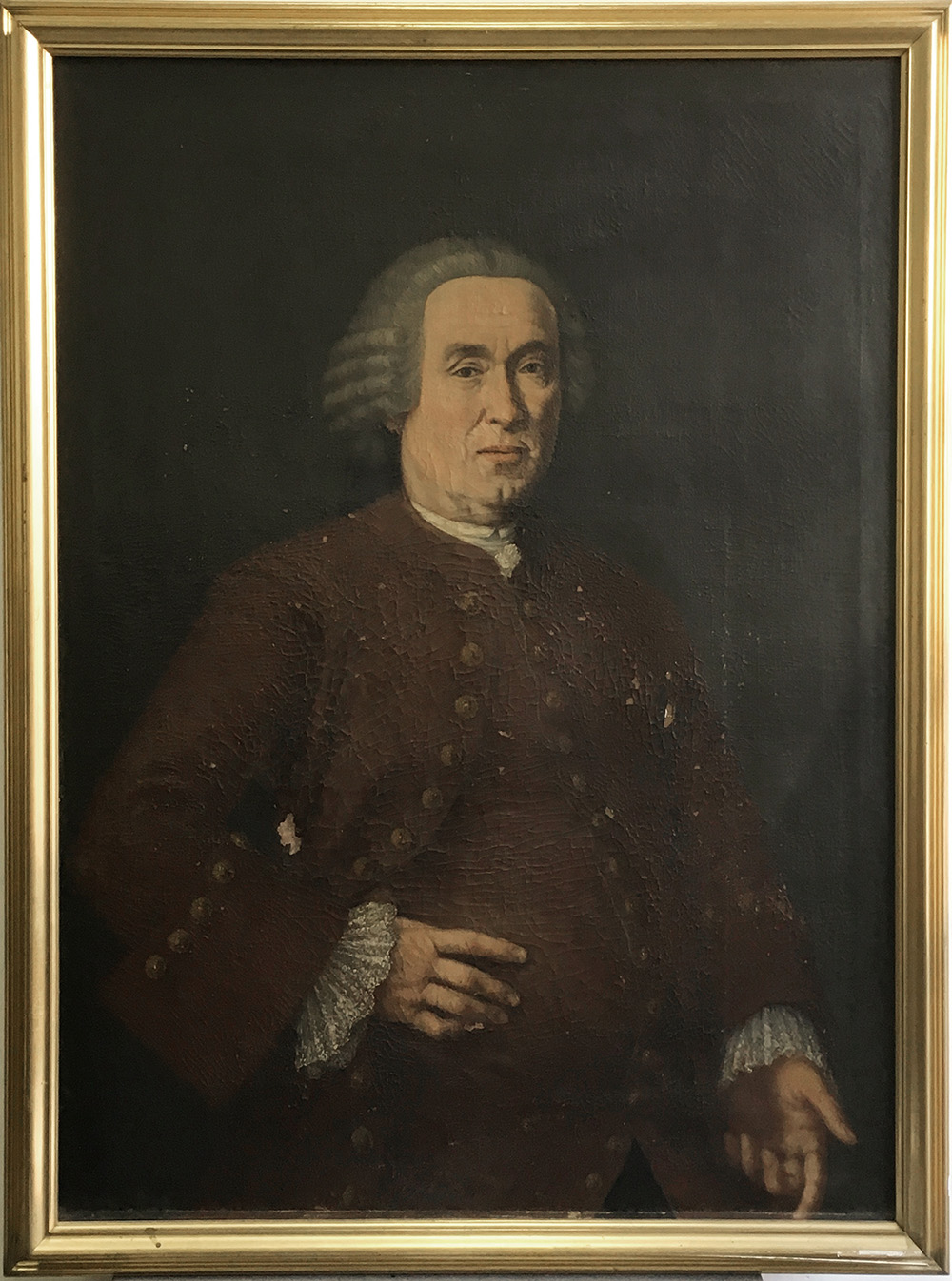 Maestro lombardo del secolo XVIII "Ritratto di Cesare Parravicini" 1768 olio su tela (cm 100x75) sul retro antica iscrizione: "1768/ Nob. D. Cesar Paravicinus de Servilis aet. An. 69" . In cornice (gravi difetti e restauri)