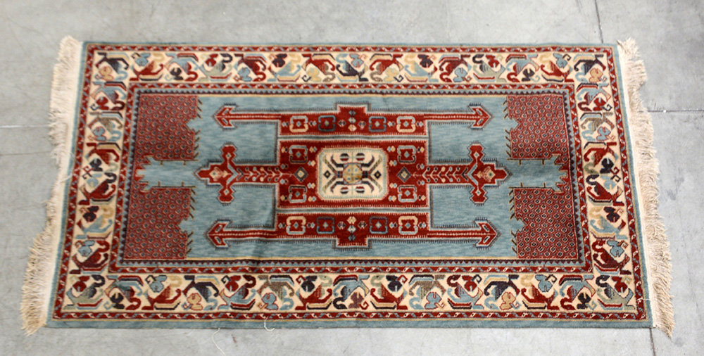 Tappeto meccanico con disegno orientale nei toni del rosso e dell'azzurro (cm 177x99) (difetti)