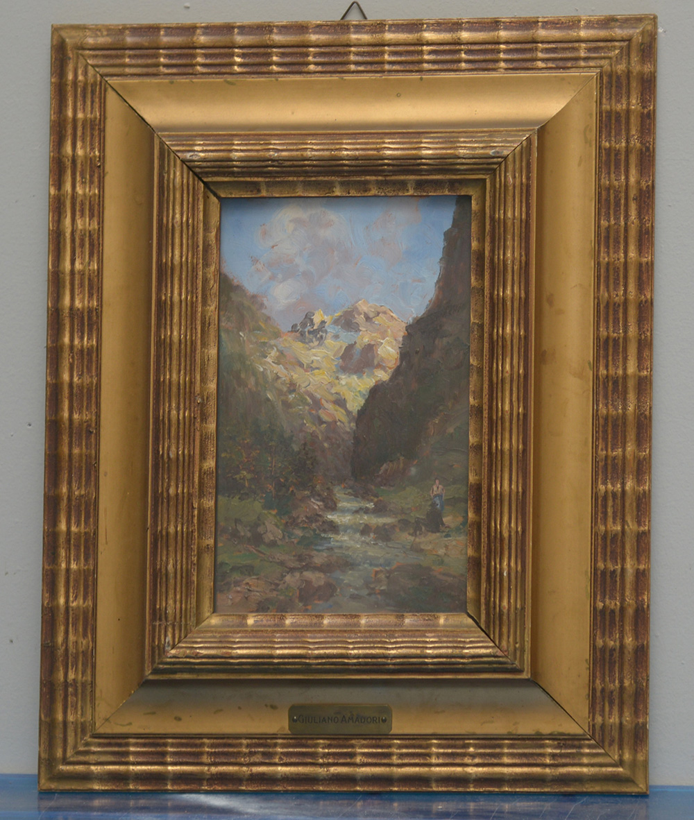 "Torrente alpino" olio su compensato (cm 30x19) in cornice in legno dorato. Firmato e datato in basso a destra e inscritto al verso "Giuliano Amadori 1932"