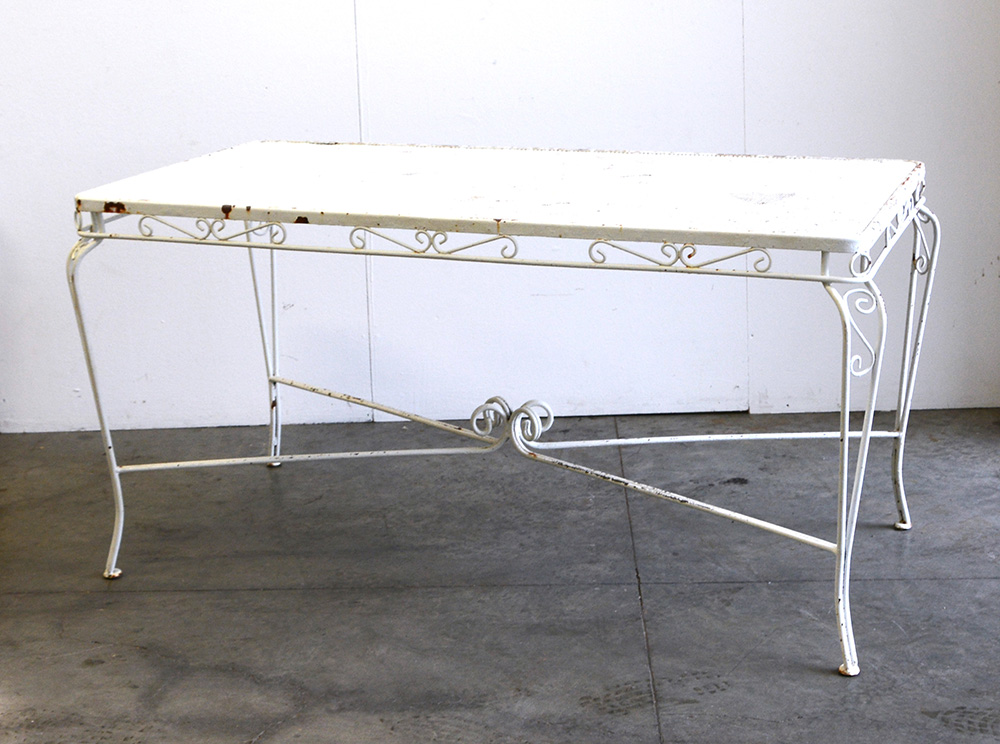 Tavolo rettangolare da giardino in ferro smaltato bianco, con gambe mosse riunite da crociera e piano traforato (cm 150x75x75) (difetti)