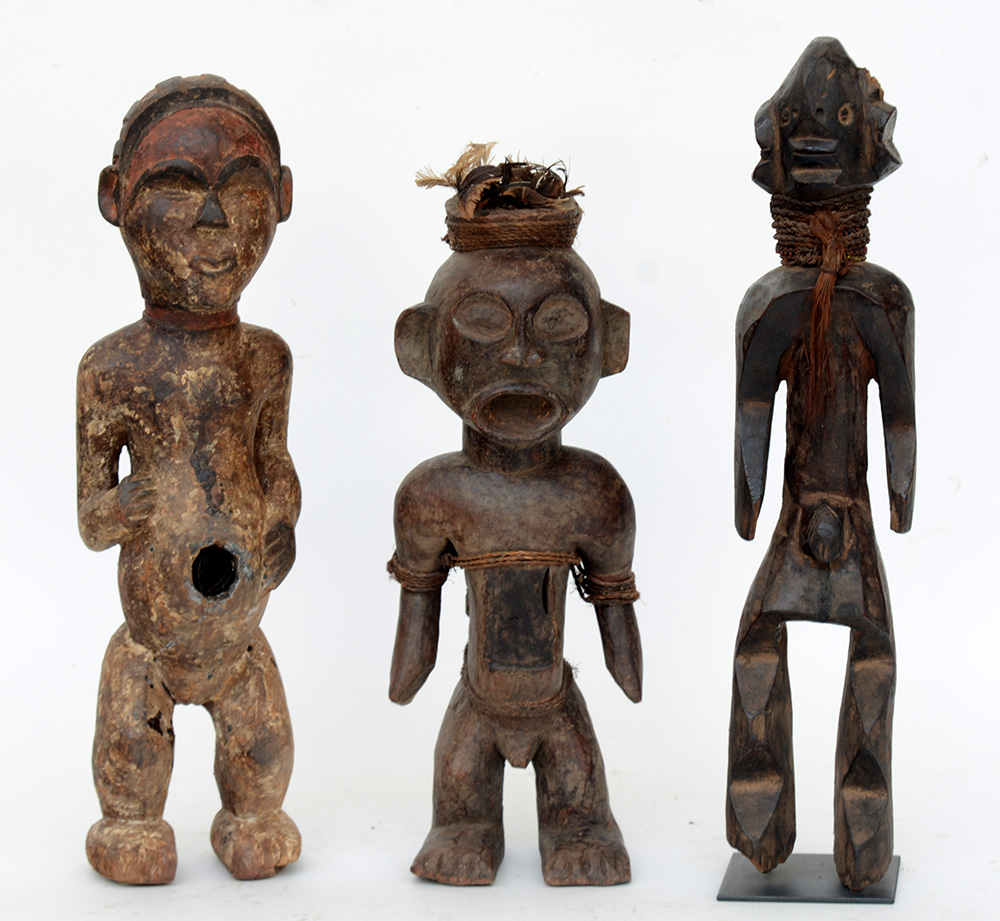 Arte africana, lotto di tre sculture rituali in legno e pigmenti con elementi in fibra vegetale, piume e capelli (h max cm 52) (difetti)