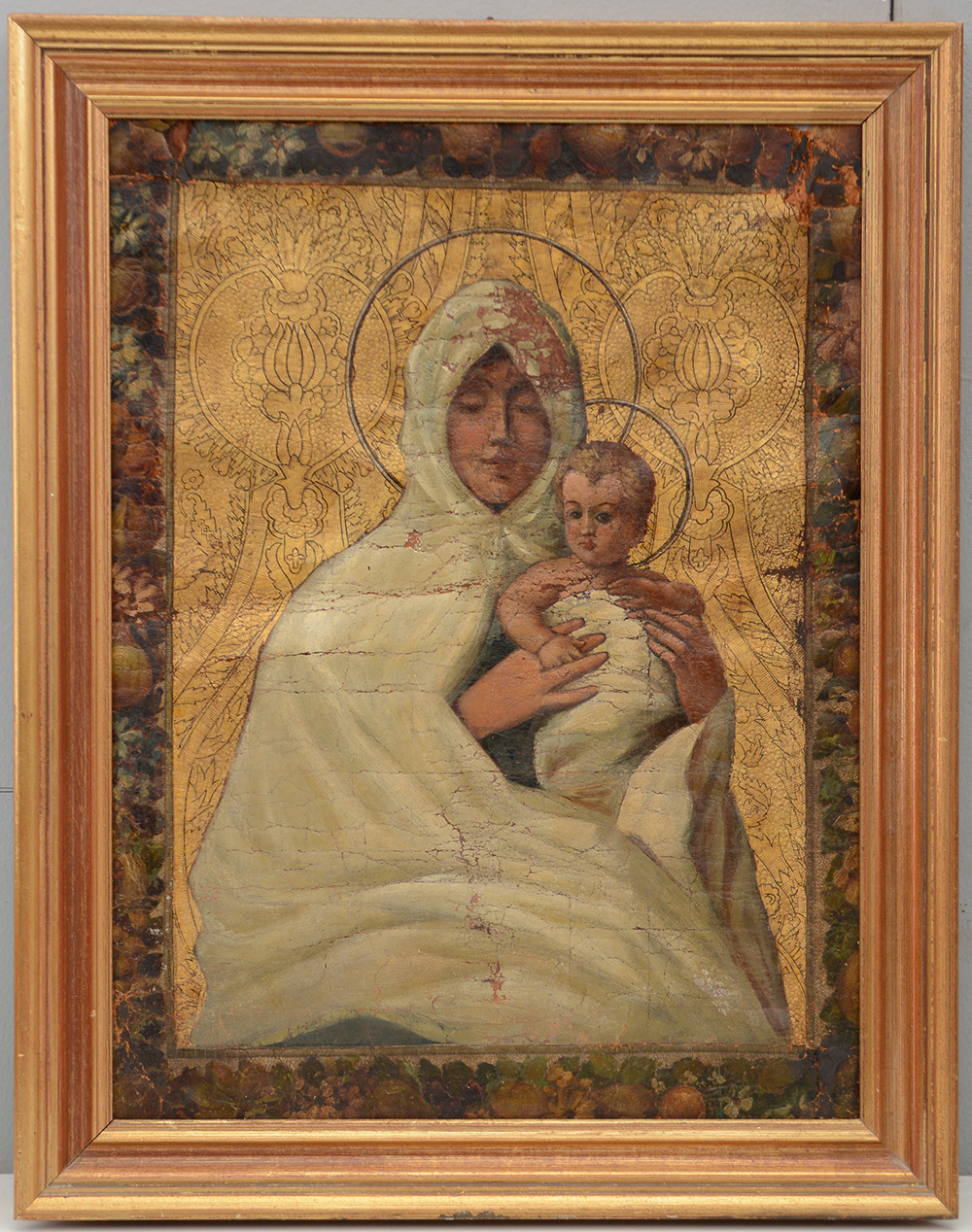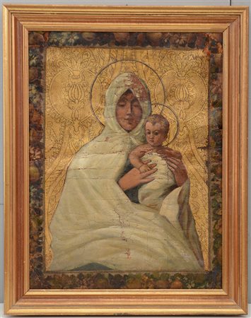 Ignoto "Madonna con Bambino" olio su cuoio (cm 63x47) in cornice (difetti)