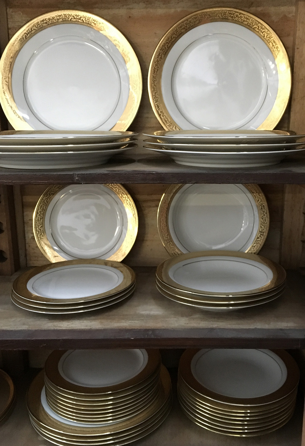 Servizio di piatti in porcellana con bordo dorato composto da: dodici piatti fondi, dodici piani e dodici per frutta (difetti)