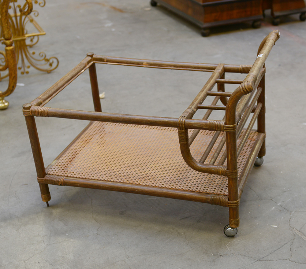 Carrello da veranda rettangolare in bambù con piano inferiore incannucciato e superiore in vetro (difetti)