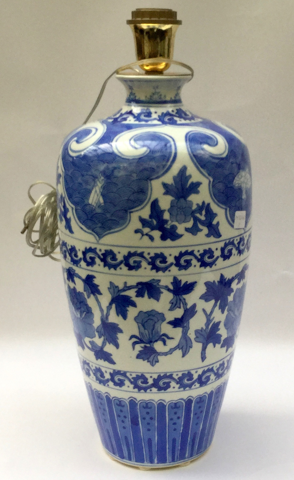 Vaso montato a lampada in porcellana bianca e blu decorata a motivi floreali. Manifattura moderna cinese (h cm 42)
