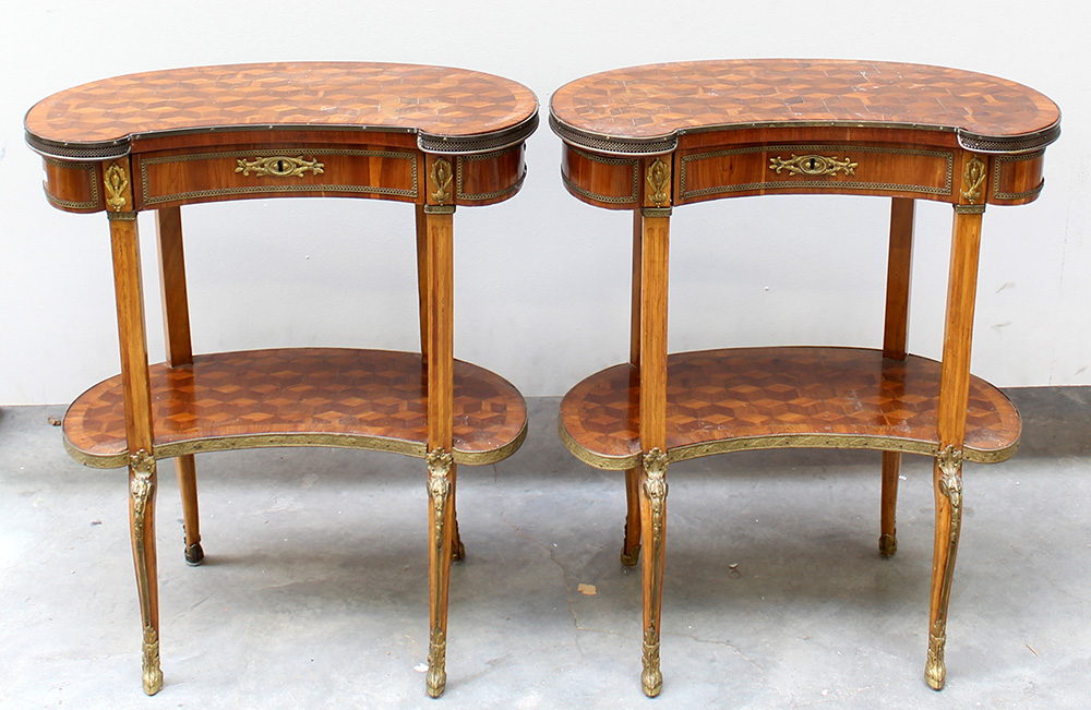 Coppia di comodini a fagiolo intarsiato in legni vari a marqueterie, a due ripiani con piedini mossi. Profili e guarnizioni in metallo dorato, Francia inizio secolo XX (cm 57x69x32) (difetti)