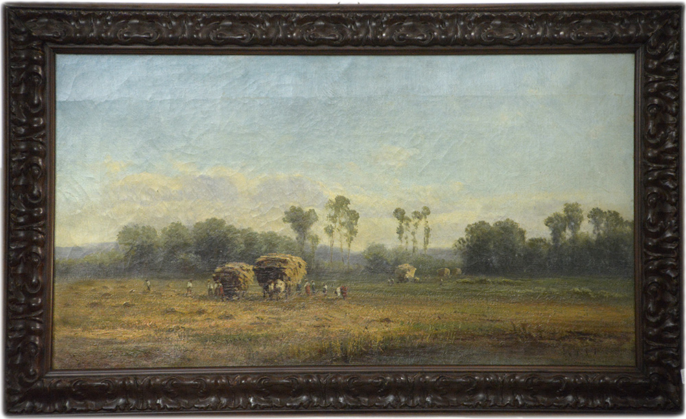 Scuola del secolo XIX "Scorcio di campagna con contadini" olio su tela (cm 37x67) in cornice (difetti)