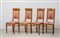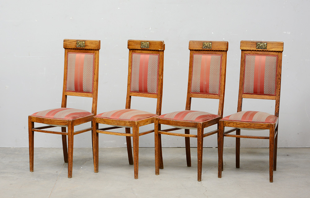 Gruppo di quattro sedie "Liberty" con schienale decorato da placca in metallo...