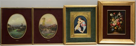 Lotto composto da quattro dipinti ad olio raffiguranti Madonna con bambino, fiori in un vaso e paesaggi. Autori e misure diverse, in cornici (difetti)
