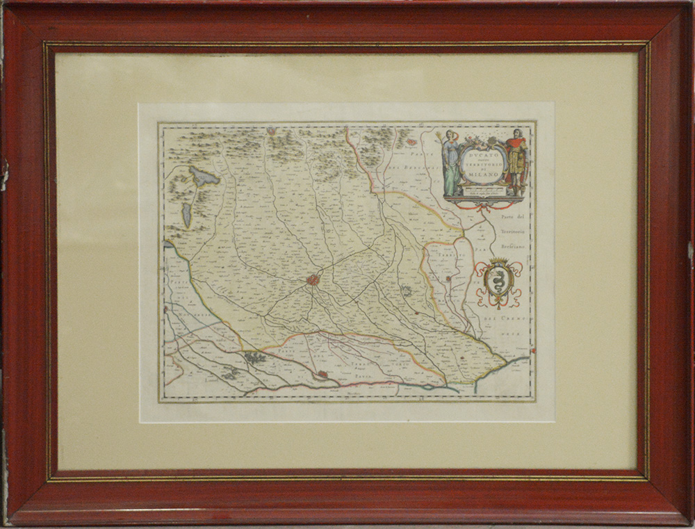 Carta geografica a colori del scolo XVIII raffigurante il Ducato di Milano (cm 42x55) in cornice laccata rossa (difetti)