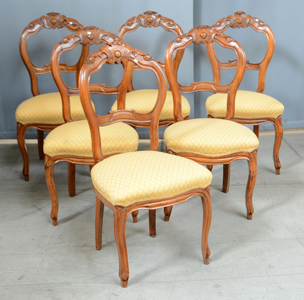 Gruppo di sei sedie Luigi Filippo in legno con schienale a giorno e seduta rivestita in tessuto giallo (difetti e restauri)
