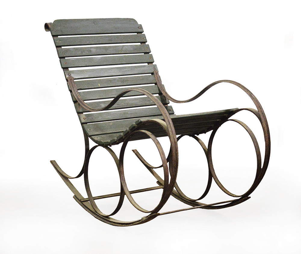 Poltrona a dondolo in ferro battuto a riccioli, seduta e schienale a listelli orizzontali in legno laccato verde, inizio secolo XX (difetti)