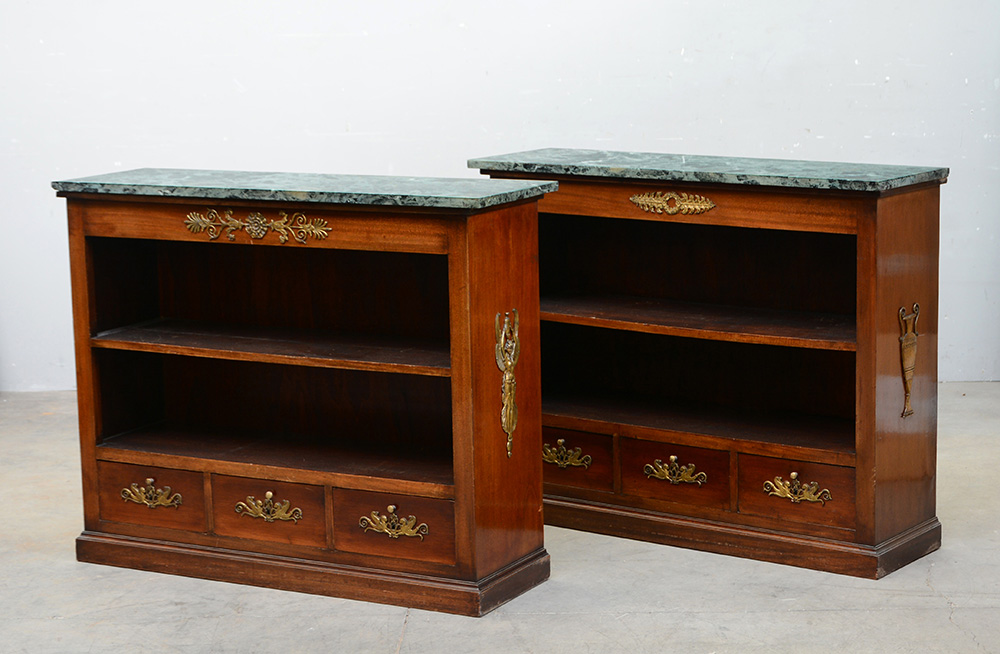 Coppia di libreriette in stile Impero a tre cassetti nella base e vani a giorno, decorati da fregi in metallo dorato e cesellato a motivi vegetali, erme alate e vasi biansati, piani in marmo verde (cm 110x88x34)(difetti)