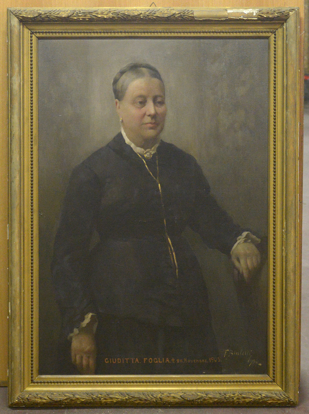 "Ritratto di Giuditta Foglia" 1906 olio su tela (cm 110x75) firmato e iscritto in basso a destra, in cornice (difetti e mancanze)