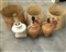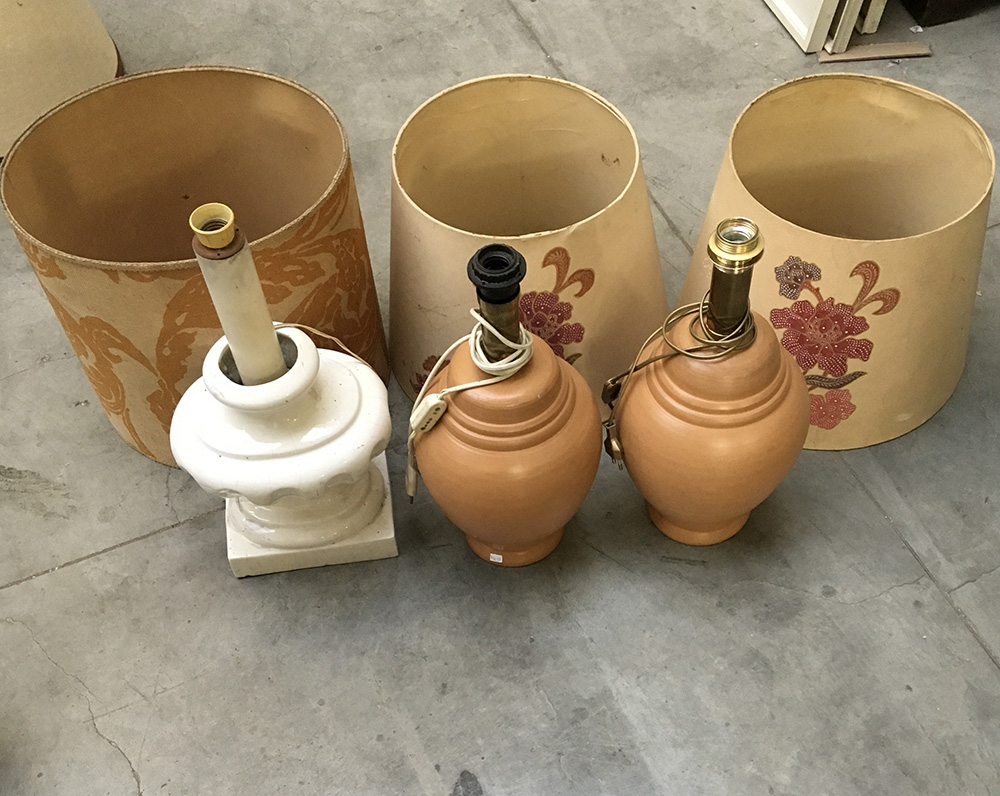 Lotto composta da una coppia di lampade da tavolo in terracotta (h cm 39,5) a cui si unisce una lampada da tavolo in ceramica bianca (h cm 49) con paralumi in stoffa (difetti)