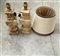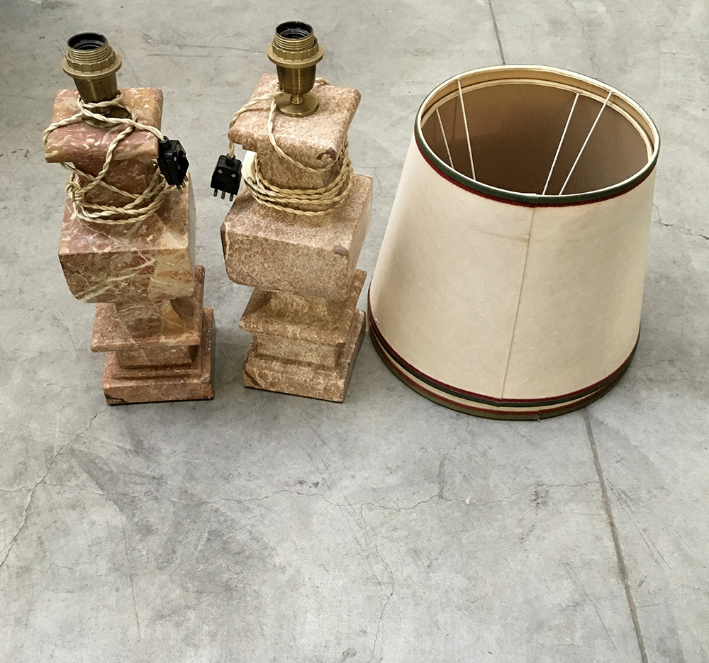Coppia di lampade da tavolo in marmo rosso (h cm 49) con paralume in stoffa (difetti)