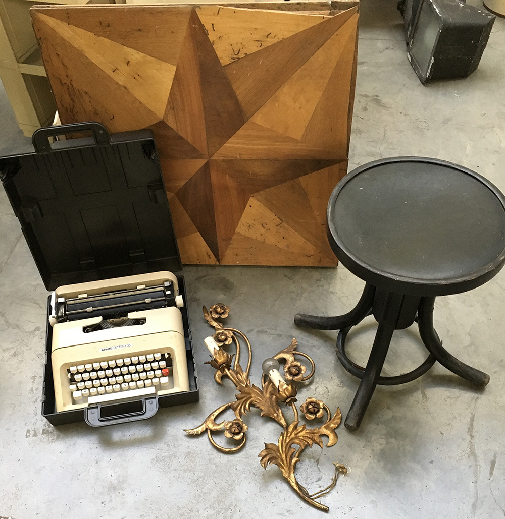 Lotto composto da un pannello in legno decorativo con rosa dei venti, uno sgabello in legno nero, un applique in ferro dorato a due luci e una macchina da scrivere olivetti "lettera 35" (difetti).