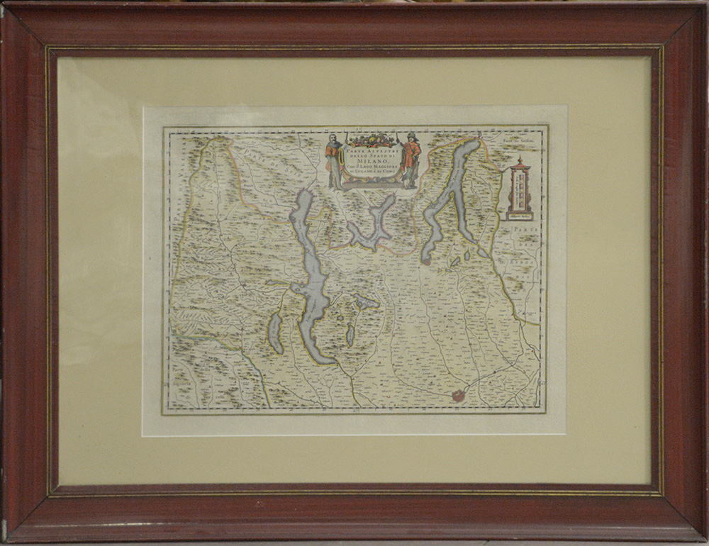 Carta geografica a colori del secolo XVIII raffigurante la parte alpestre dello Stato di Milano con il Lago Maggiore, di Lugano e di Como (cm 42x55) in cornice laccata rossa (difetti)