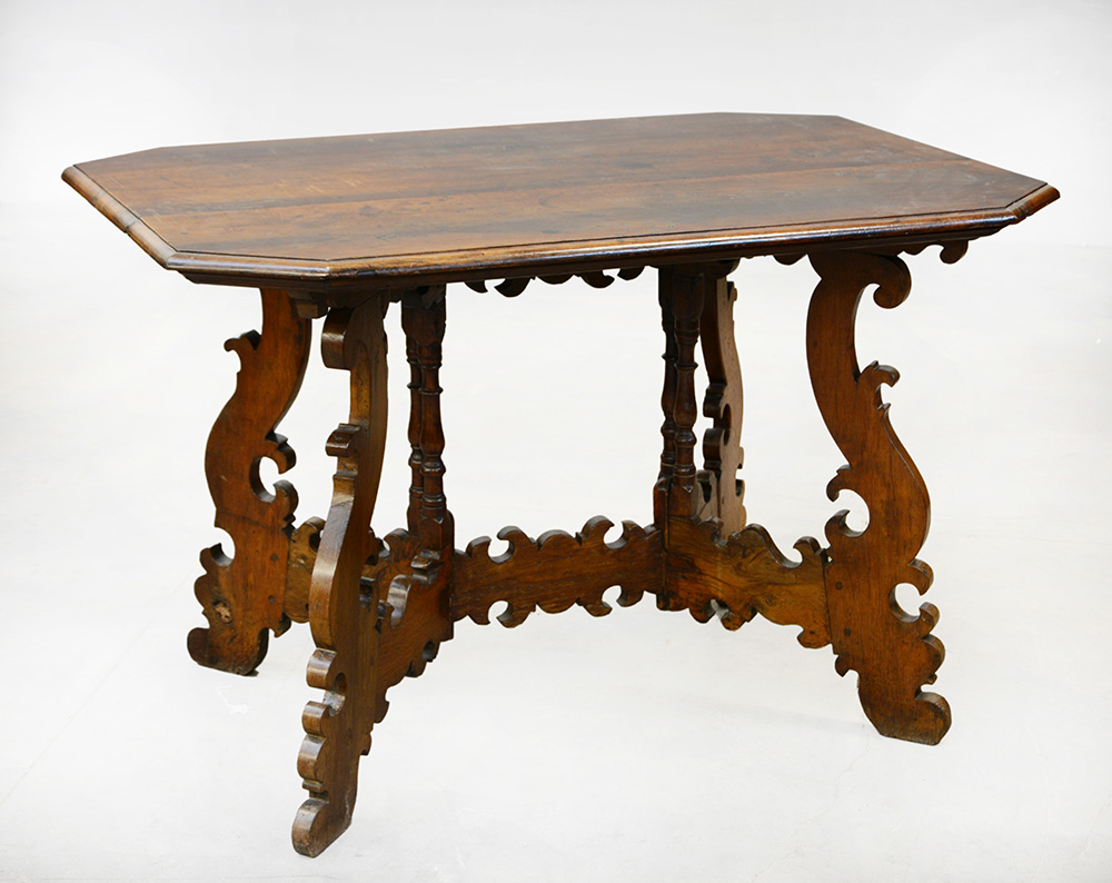 Lotto 4658 | Tavolo con piano ottagonale, gambe e traverse sagomate, montanti centrali...