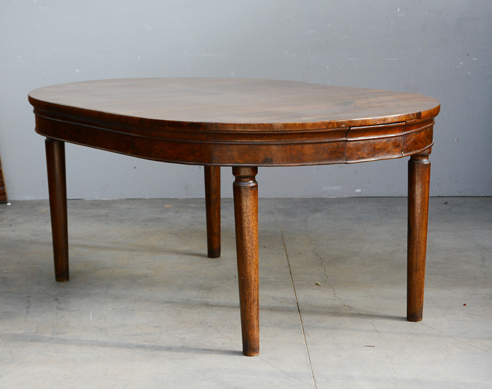 Tavolo da pranzo in noce con piano ovale, fascia lastronata in radica a due cassetti, gambe tornite, secolo XIX (cm 184x81x125)(difetti e restauri)