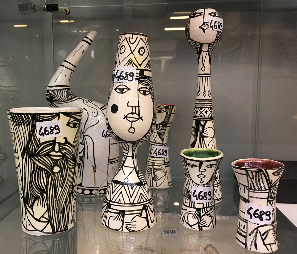 Lotto di sette oggetti in ceramica smaltata in bianco e decorato con disegni geometrici in bruno. Padova, anni '50. Marcato sotto la base. (gravi difetti)