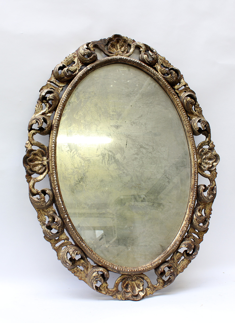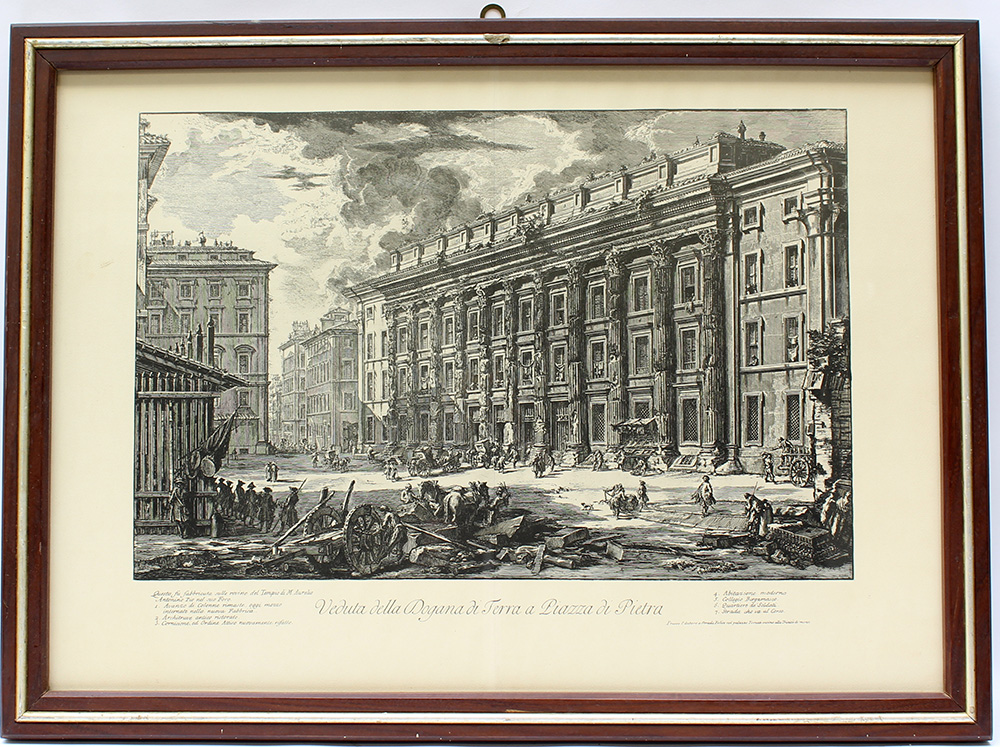 Lotto composto da un poster di Roy Liechtenstein, una riproduzione da Piranesi e una specchiera ovale con cornice in legno intagliato a volute (difetti)