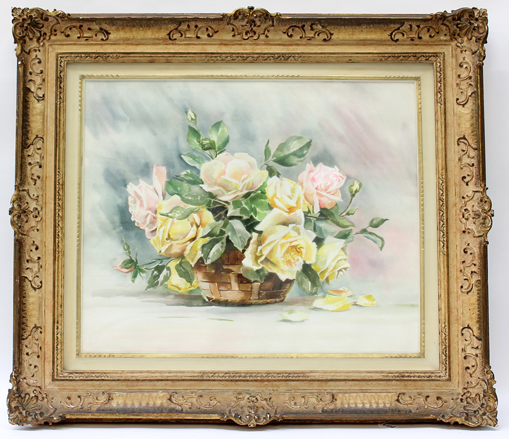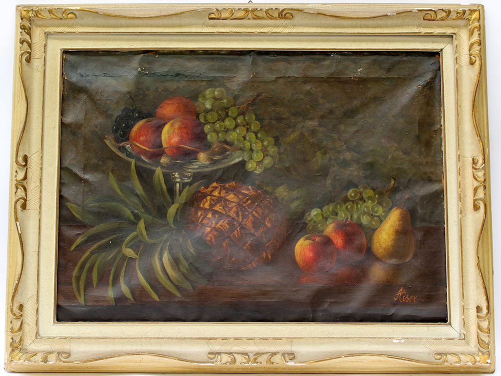 Lotto composto da un dipinto ad olio su tela raffigurante frutta firmato in basso Aiser e un acquarello raffigurante rose, misure diverse. In cornici (difetti)