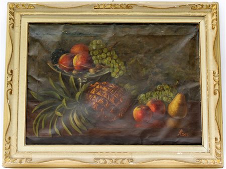 Lotto composto da un dipinto ad olio su tela raffigurante frutta firmato in...