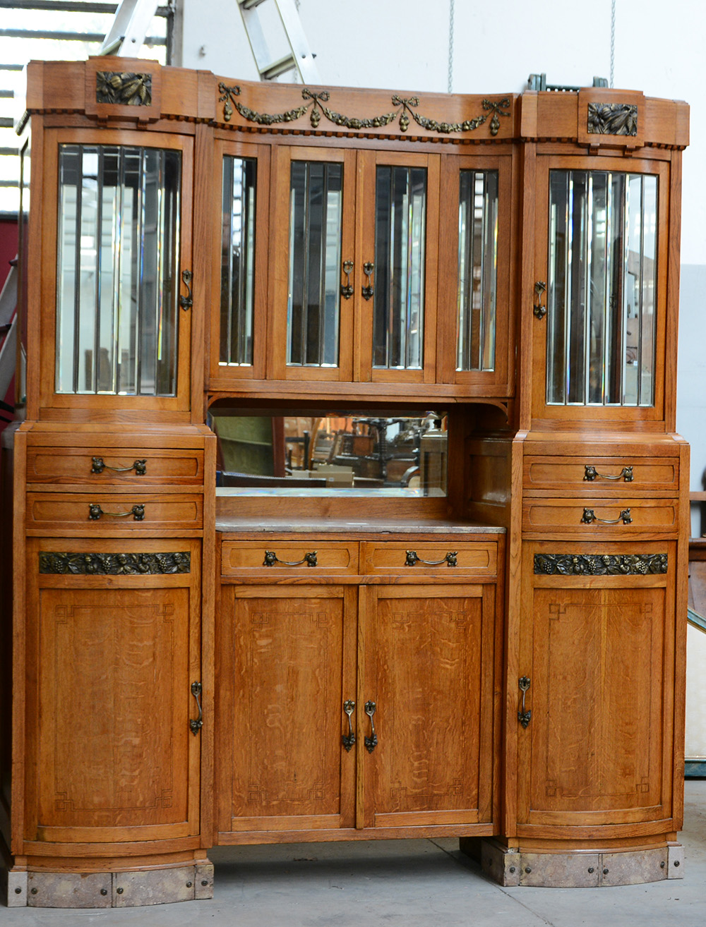 Credenza Liberty a due corpi in legno lastronato e filettato, parte superiore a quattro ante a vetri e quattro cassetti, parte inferiore a quattro ante, un cassetto e pianetto in marmo, decorata da placche e fregi in metallo, inizio secolo XX (cm 200x236x58)(difetti)