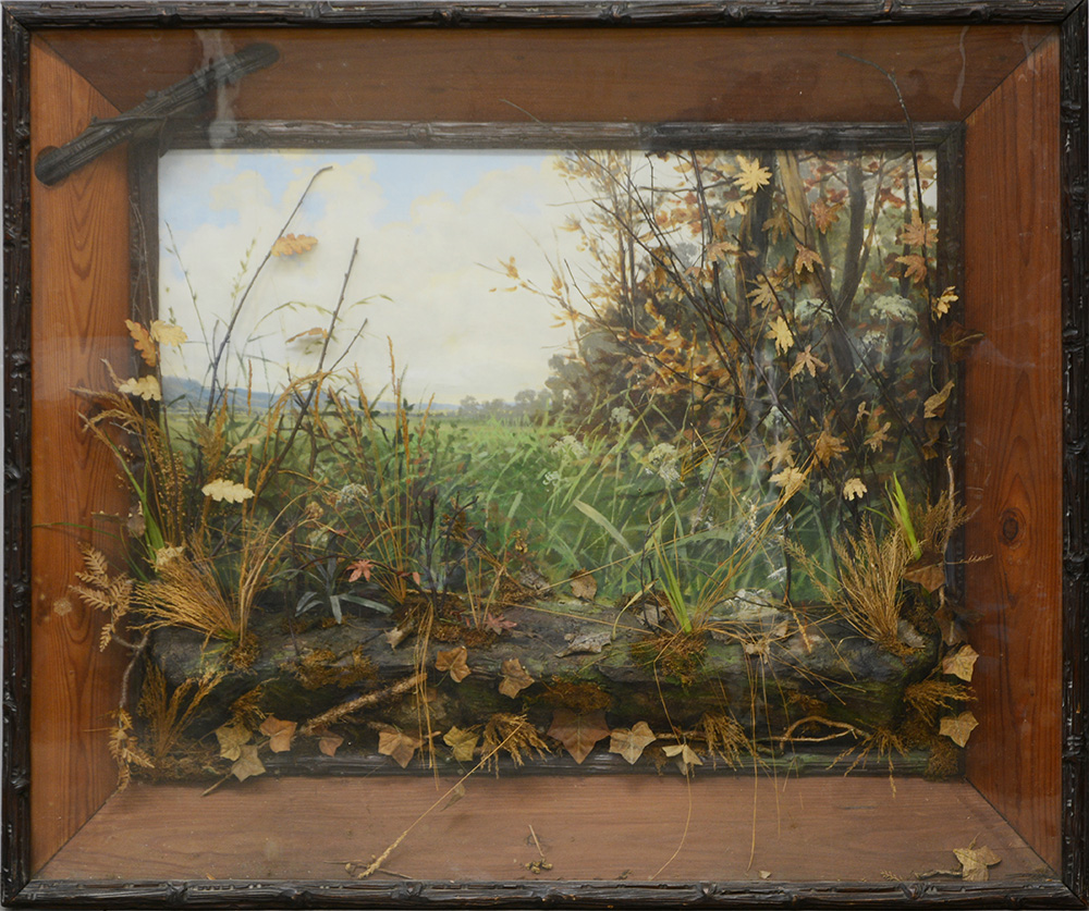 Diorama della fine del secolo XIX decorato con rami e foglie in un paesaggio,...