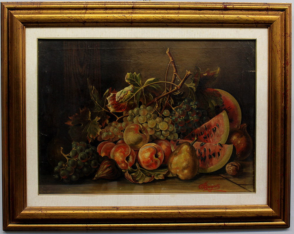 Bugatti (secolo XX) "Natura morta con frutta" olio su tela (cm 50x70) firmato in basso a destra, in cornice (difetti)