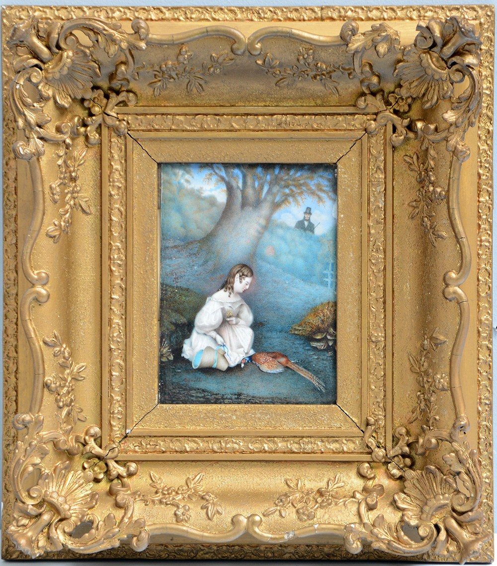 Ignoto "Il commiato al fagiano" olio su avoriolina (cm 18x13,5) in cornice di legno e pastiglia dorata (difetti)