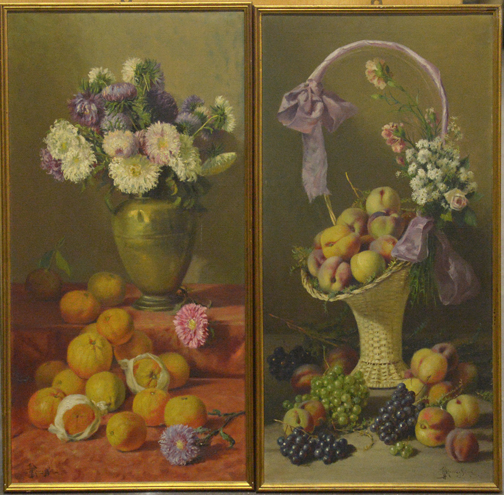 "Vaso con fiori e cesto con frutta" coppia di oli su tela (cm 100x50) firmati in basso a sinistra e a destra, in cornici