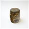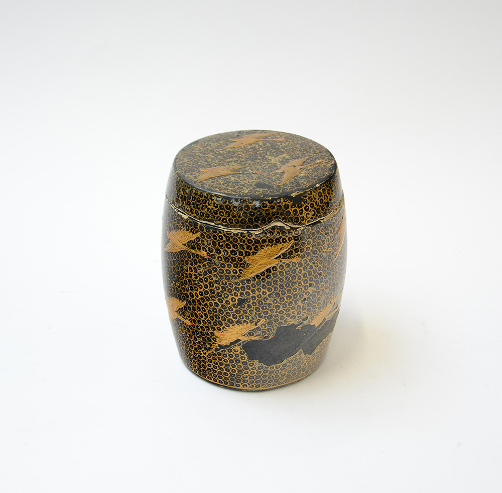 Contenitore con coperchio a forma di botticella in legno laccato e dorato con gru in volo, interno in rame (h cm 18, d cm 13) (difetti)