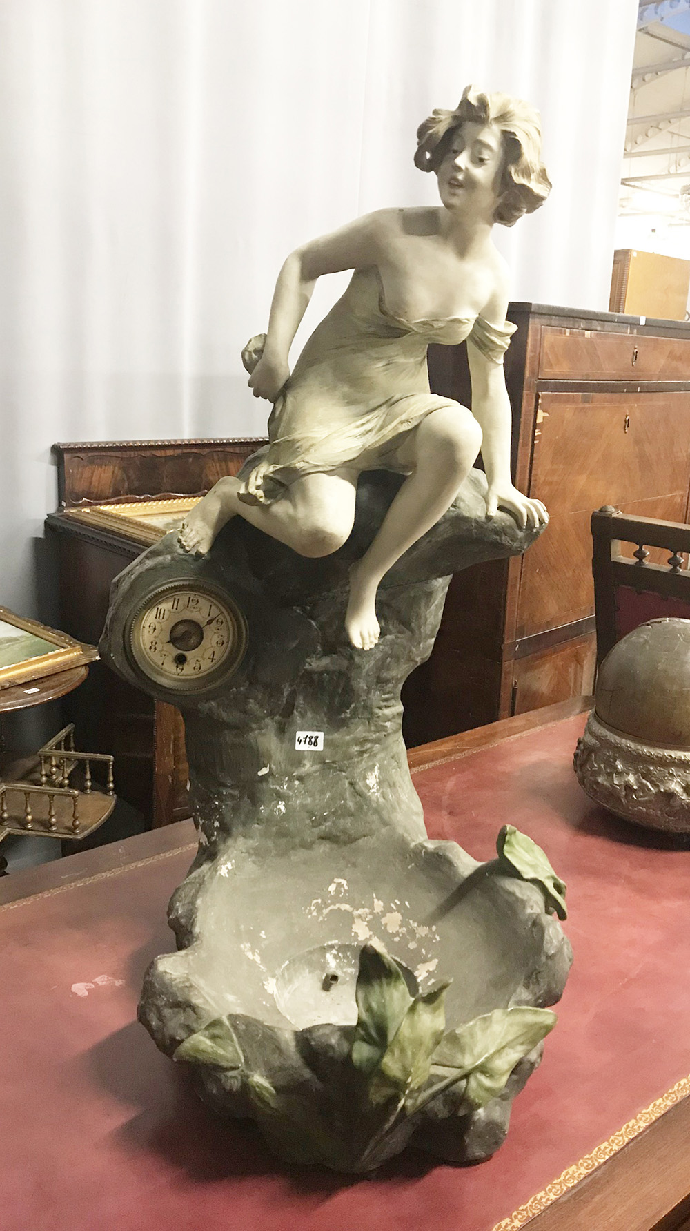 Manifattura inizio secolo XX. Modello di fontana in gesso decorato in policromia con figura femminile a tutto tondo, con iserito orologio con quadrante a numeri arabi (h cm 82) (difetti)